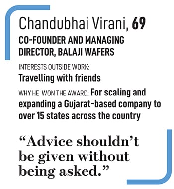“We understood the consumer, what to give the consumer, at what rate, the quality, the quantity. Because we ensured the customer was satisfied, the shopkeeper’s sales increased, the number of dealers increased, then transporters. Our employees increased, and our suppliers too. People were also happy to partner with us because we never delayed a single payment,” says the co-founder and managing director of Balaji Wafers, which has won the Forbes India Leadership Awards Regional Goliath award.