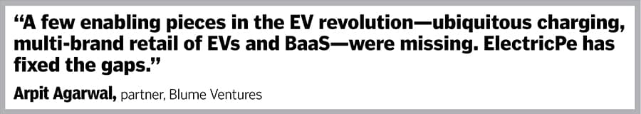 The backers are delighted with the startup’s progress. “When we invested in ElectricPe in 2021, the electric mobility revolution was well underway," says Arpit Agarwal, partner at Blume Ventures. However, a few crucial enabling pieces—such as ubiquitous charging infrastructure, multi-brand retail of EVs, and affordability solutions like BaaS (battery as a service)—were missing. “We aligned deeply with Avinash and Raghav’s vision of powering the adoption of electric mobility," he says, adding that the founding team has executed well on the original business plan, creating possibly India’s largest charging network with over 90 percent uptime. Over the last few months, the MBO (multi-brand outlet) business has scaled, creating trust among thousands of customers across Bengaluru and nearby regions.