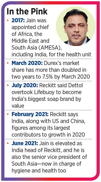 In 2017, Jain who is a BITS-Pilani and IIM-Calcutta graduate, and is a foodie who loves a game of cricket, was appointed chief of Africa, the Middle East and South Asia (AMESA), including India, for the health unit following the restructuring of Reckitt’s division into two units of health and hygiene. Since then, he has been instrumental in aggressively expanding the reach of brands such as Dettol, Veet, Durex and Strepsils in India. The results have been phenomenal. Reckitt claims that, in 2020, Dettol toppled Lifebuoy to become the biggest soap brand by value. And Durex’s value market share more than doubled from 2.8 percent in 2018 to 7.5 percent by March 2020, according to analysts quoting Nielsen data.