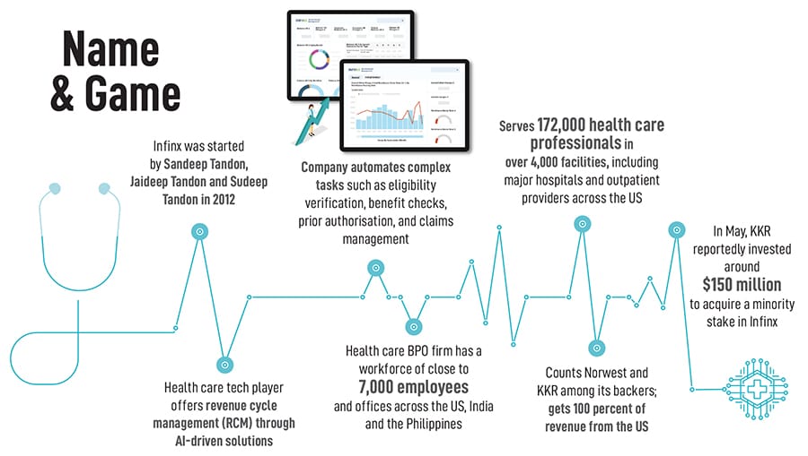 Started in 2012 by brothers Sandeep, Jaideep and Sudeep Tandon, Infinx is an AI-driven health care tech player that offers revenue cycle management (RCM). The health care BPO automates complex tasks such as eligibility verification, benefit checks, prior authorisation, and claims management, and has a wide footprint of a workforce of close to 7,000 employees, and offices across the US, India and the Philippines. “Over the last three years, we have been growing at almost 45 to 50 percent year on year organically," claims Sudeep Tandon, co-founder of Infinx. The DNA of the company, he underlines, is to solve customer problems using technology.