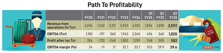 Subsequently, as the long-term effects of the pandemic began to ease, the measures taken under duress continued to bear fruit. The third quarter of FY25 marked 11 consecutive quarters of record performance by the company: Revenue and PAT have grown by 29 percent year-on-year to Rs2,592 crore and Rs582 crore respectively. This was in sharp contrast to the years between FY11 and FY17, when IHCL reported a negative PAT, except a marginal profit of Rs3 crore in FY12.