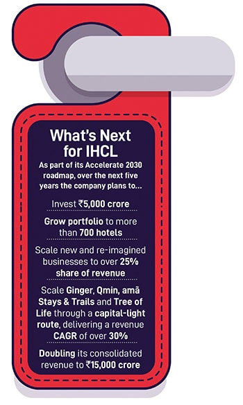 IHCL’s strategy will centre on driving top-line growth, with 75 percent coming from traditional businesses and management fees, while over 25 percent will be generated from new and reimagined ventures. Chhatwal believes brands such as Ginger and am࣠Stays can be scaled up a lot more and a lot faster. “There should be at least 500 Ginger-branded properties in India," he states currently, there are 102.