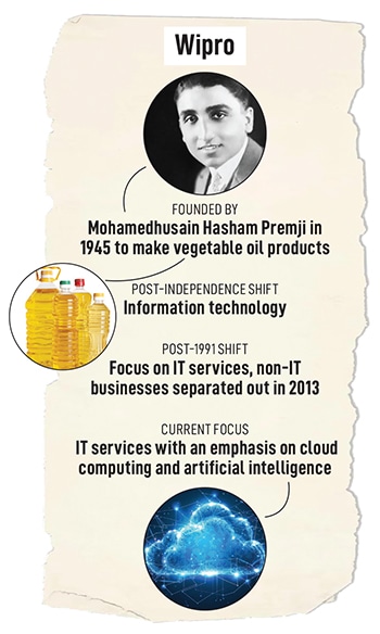 Wipro was born in December 1945 as Western India Vegetable Products and listed on the Bombay Stock Exchange in June 1947. The company’s name first changed to Wipro Products in 1977 and then to Wipro in 1982. Its current avatar, one could say, was born in 1979 when the then-managing director Azim Hasham Premji—and the founder of what Wipro is today—decided to diversify into information technology (IT).