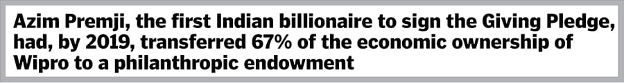 Azim Premji is also widely acknowledged as one of India’s biggest philanthropists. The first Indian billionaire to sign the Giving Pledge, by 2019 he had systematically transferred 67 percent of the economic ownership of Wipro, the listed IT services company, to the philanthropic endowment administered by Azim Premji Foundation. At that time, including that ownership, the endowment was worth $21 billion. By 2023, it was worth $29 billion.