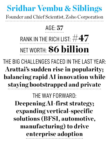 That contentment has remained with him over the years. Vembu is ranked 47th, on the 2025 Forbes India Rich List with a net worth of $6 billion—up from $5.8 billion in 2024. Despite being one of the wealthiest men in India, he has a philosophical take on wealth: “Look, I had a nice breakfast—I ate some dosas. I can’t eat 20 dosas, even if I like them. If I enjoy filter coffee, I can’t drink 50 cups. There’s a limit to everything,” he says, adding, “No matter how wealthy you are, there are only 24 hours in a day. If you can’t sleep, infinite wealth won’t help you. If your body aches, wealth isn’t the answer. Infinite wealth won’t stop my beard from turning grey.”