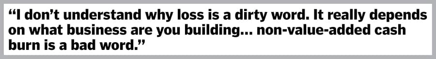 Well, I don’t have such an evolved view. Businesses like Swiggy couldn’t have been built in a bootstrapped way. It was impossible. Maybe some businesses can be built like that—there are so many great bootstrapped businesses such as Directi and Zerodha. It’s great, but our journey was always going to need investment. And if you need investments, what is it for? It is for burn only. It is to go and build the market. So, I don’t understand why loss is a dirty word. It depends on what business you are building. When you have excesses, when the burn doesn’t add value, it’s (cash burn) a bad word. All of us make mistakes and learn, and then try to incorporate those learnings. So non-value-added cash burn is a bad word. Nobody should do it. You should do everything you can to avoid excesses. Our business could not have been built without cash burn. Without losses, we wouldn’t have built any of it.