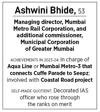 A decorated IAS officer—she stood first among women candidates in UPSC and ninth overall—Bhide is managing director of the Mumbai Metro Rail Corporation (MMRC) and additional commissioner of the Municipal Corporation of Greater Mumbai. She’s been the driving force of Mumbai Metro-3 (Cuffe Parade to Seepz) that is touted to be the new lifeline of the city.