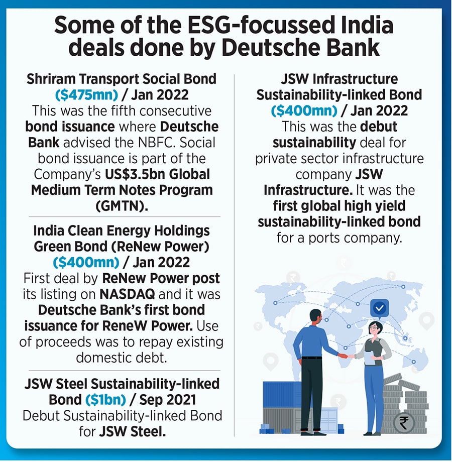 India is marching decisively towards these opportunities. India will also have the advantage of providing to the world cost-effective solutions in these new markets. Development of required expertise and development of these markets in India will result in economic growth and deliver jobs to young people. Given the level of talent in India, it could very easily become the biggest market of sustainable finance or sustainable technology expertise in the world. Q. You have spoken about wanting to make Deutsche Bank the No 1 ESG bank for India? How far are you from that goal? Simply put, I have two KPI—the first is to build the ESG business in Asia and then build a credible brand around it. The aim is to be the most diligent and innovative about applying our high ESG standards and find solutions which other banks cannot do or might not have the capacity to implement. I often tell the leadership team that it is too early in the development of sustainable finance market to get fixated on volumes. Globally, we have committed to a sustainable finance business volume of €500 billion by end of 2025. At the end of 2022, we have achieved a cumulative sustainable financing and investment amount of €215 billion, outperforming our target by €15 billion. We also plan to hire the smartest people in ESG. We cannot do this if we are seen as just an average bank. Asia is the place where we can significantly enhance our brand. It is hard to do ESG credibly in Asia if we can do it here, we can do it in North America or Europe.