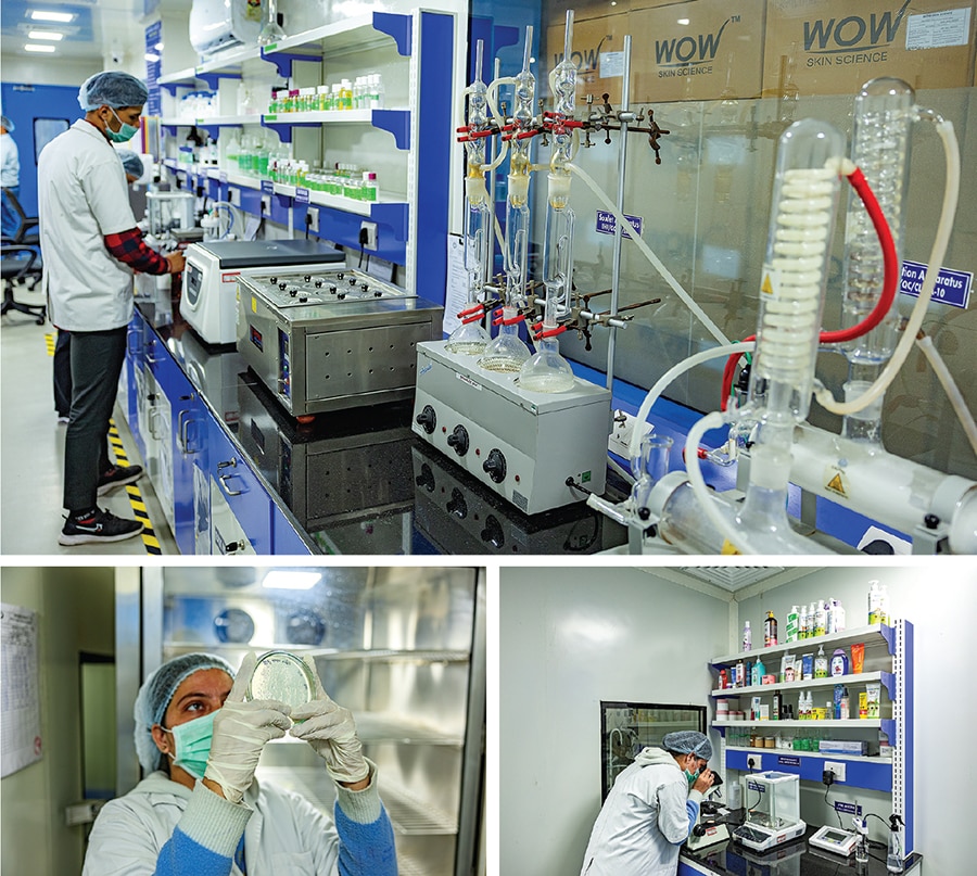 (Top) Indo Herbal’s R&D lab where new formulations are developed and tested (bottom, from left) the micro lab where samples are tested for bacteria and fungi products of various brands are monitored for long-term stability