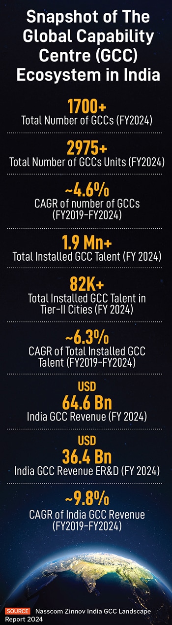 GCCs accounted for a $64.6 billion share of India’s $250 billion IT services and ITES exports in FY24. And within that, engineering R&D services accounted for $36.4 billion for FY24, according to a September 2024 report titled ‘The India GCC Landscape Report’, commissioned by Nasscom and put together by the consultancy Zinnov. It projects India’s GCC exports at $105 billion by 2030.