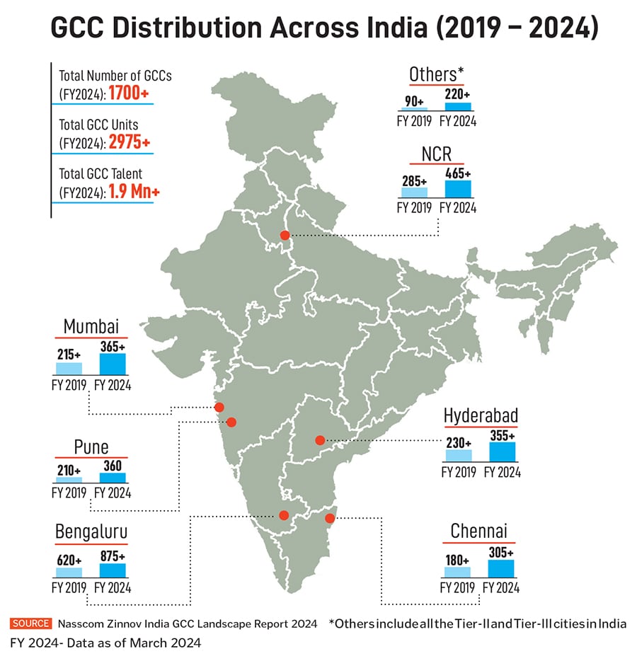 Overall, Nasscom projects the number of GCCs in India to increase from about 1,700 in the fiscal year ended March 31, 2024, to 2,100 by 2030, spread across Bengaluru, Hyderabad, Chennai, Mumbai-Pune and Delhi-NCR. These centres are expected to expand their units into India’s Tier II cities as well, where they already have a small presence today.