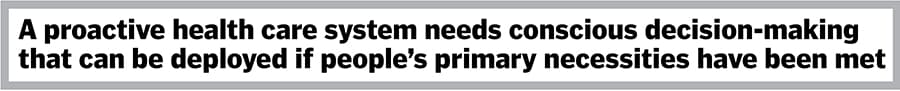 This becomes even more necessary as the current medical system is reactive, mainly curative in India, and it does not cater to preventive care because of broad generalised testing and its associated costs. A proactive health care system requires conscious, proactive decision-making, which includes aspects of an individual’s personal history, habits, lifestyle, disease predisposition and ongoing health care issues, which can only be deployed if the individual’s primary necessities, that is, food, shelter and security, have been met.