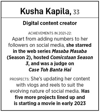 Kapila has now made the shift from mobile to the big screen. In 2020, she starred in Ghost Stories, in a segment directed by Karan Johar. She is now awaiting the release of her next—Sukhee with actor Shilpa Shetty. The content creator also featured in the web series Masaba Masaba (Season 2) on Netflix in 2022 and considers it an honour to get mentions in reviews. She hosted Comicstaan Season 3 on Amazon Prime Video and is a judge on Case Toh Banta Hai, a comedy show involving celebrities. “I want to extend to doing different things. How long can you do the same thing and profit of it?" she asks.