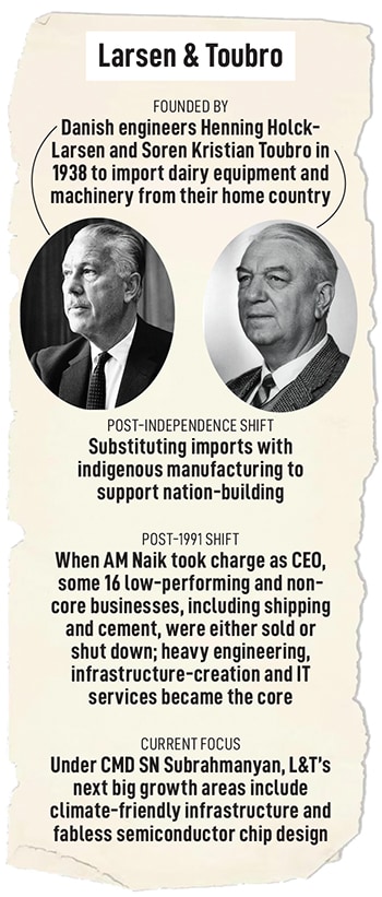 If Naik is synonymous with the ‘new L&T’, 1.0 dates to pre-Independence when two Danish engineers, Henning Holck-Larsen and Soren Kristian Toubro, started the partnership company in 1938 out of a cubicle in the then-commercial district of Bombay, Ballard Estate. As R Gopalakrishnan and Pallavi Mody write in How Anil Naik Built L&T’s Remarkable Growth Trajectory (Rupa, 2020), “Little did they know then that they were making this hot, humid and dusty foreign land their karmabhoomi."