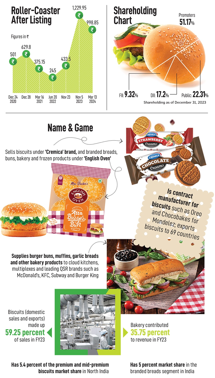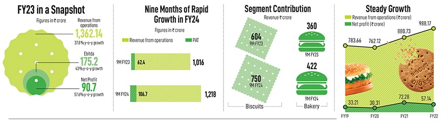Fast forward to 2024, Mrs Bectors has become a name to reckon with. The company supplies burger buns, muffins, garlic breads and other bakery products to cloud kitchens, multiplexes and leading QSR brands such as McDonald’s, KFC, Subway and Burger King. It is the contract manufacturer of biscuits such as Oreo and Chocobakes for MondelÄ“z, and exports biscuits to over 69 countries. While biscuits (domestic sales and exports) made up 59.25 percent of sales in FY23, bakery contributed 35.75 percent to revenue. Cremica has a 5.4 percent of the premium and mid-premium biscuits market share in North India, and English Oven has a 5 percent share in the branded bread segment in North India.