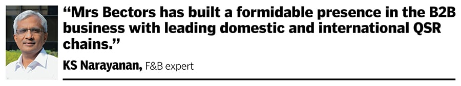 Mrs Bectors Food, reckon food and beverage analysts and industry experts, is well poised to scale aggressively over the next few years. “Mrs Bectors has built a formidable presence in the B2B business with leading domestic and international QSR chains," says KS Narayanan, an F&B expert. A long stint of working with top global QSR chains, he underlines, has done wonders for the profile of the company. First, it has helped it to churn out high volumes consistently. Second, it has equipped its manufacturing plants to meet global quality and security standards. Third, geographically well-dispersed plants help it to expand its national footprint. Lastly, B2B clients have to keep innovating at a furious pace. “This ensures that you are on top of the food trends and game," he says.