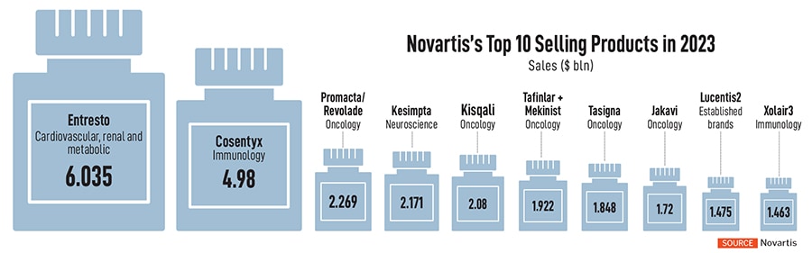 Still, towards the later part of the decade, Novartis will see some of its marquee products lose patent protection, including the popular heart drug, Entresto. The drug accounts for over $6 billion in sales as of 2023, while another drug, Cosentyx, used for psoriasis, ankylosing spondylitis and psoriatic arthritis, brings nearly $5 billion in sales.