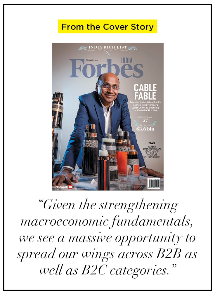 In November 2021, when Jaisinghani debuted on the Forbes India Rich List and on the cover, he spoke about Polycab identifying ways to expand its presence in international markets and future-proof the