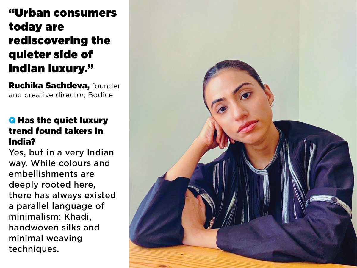 She goes on to explain that “while colours and embellishments are deeply rooted here, there has always existed a parallel language of minimalism: Khadi, handwoven silks and minimal weaving techniques. Urban consumers today are rediscovering that quieter side of Indian luxury”.