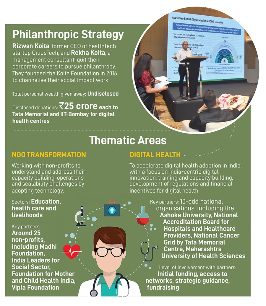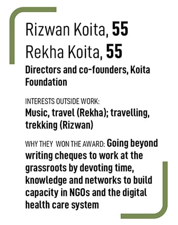 While Rekha primarily works with non-profits in the education, health care and livelihoods space, Rizwan puts his experience of running a healthtech startup to work with government, health care institutions and national-level organisations to support technology initiatives in the health care sector. The importance of technology in health care became evident to the Koitas particularly in the wake of the pandemic, spurring them to take action. Today, their Foundation works with close to 25 non-profits, and has collaborations with 10-odd organisations, like the Tata Memorial Centre, Ashoka University and the Maharashtra University of Health Sciences (MUHS).