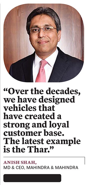 To do that, he has the unflinching support of his boss, Anish Shah, who took over as managing director and CEO of Mahindra & Mahindra Ltd in April. “Auto is a core business," says Shah. “It is an integral part of who we are and what we do. Over the decades, we have designed vehicles that have created a strong and loyal customer base. The latest example is the Thar. We have consistently performed well in our core: Authentic SUVs that are tough and sophisticated. Our strengths lie in our deep-rooted understanding of customer requirements and an ability to deliver outstanding products at a great value for our customers."