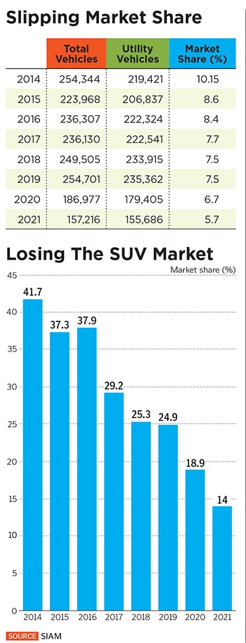 For a while now, Mahindra has been steadily losing turf, particularly its dominance in the SUV market. Its share in the utility vehicle category, according to the Society of Indian Automobile Manufacturers (SIAM), slipped from over 50 percent in 2012 to less than 15 percent in 2021. The company is now fourth, behind Maruti Suzuki, Hyundai Motors and Kia Motors in the category.