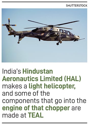 India’s Hindustan Aeronautics Limited (HAL) makes a light helicopter, and some of the components that go into its engine are made at TEAL. “So, we have quite a lot of good content that goes inside some of the most popular aircraft on the planet today."