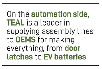 On the automation side, TEAL is a leader in supplying assembly lines to OEMS for making everything, from door latches to electric vehicle (EV) batteries. The knowhow also lends itself to other verticals, such as medical devices, electrical gear and so on, with customers such as Schneider Electric, ABB and Siemens.
