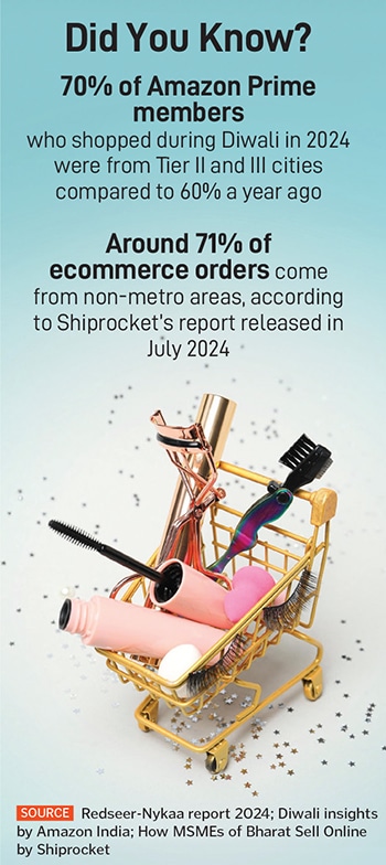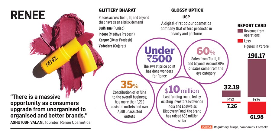 Another brand that gets a plum share from smaller towns is Renee. Around 60 percent of sales come from the hinterland, and places like Ludhiana in Punjab, Indore in Madhya Pradesh, Kanpur in Uttar Pradesh, and Vadodara in Gujarat have emerged as the new hubs. The revenue numbers speak for the sales boost: From ₹32.19 crore in FY22 to ₹191.17 crore in FY24, almost a six-times jump in two years. Ashutosh Valani, founder of Renee Cosmetics, explains what works in small towns. Conceding that price is a barrier, Valani contends that if one has managed to create a pull rather than a push, one can demand a bit of a premium. “It shouldn’t be too high but something which one can justify to the consumers," he says, adding that the buyers in smaller towns have become aware, which means they are more conscious of quality and product. “There is a massive opportunity as consumers in India and Bharat upgrade themselves," he says.