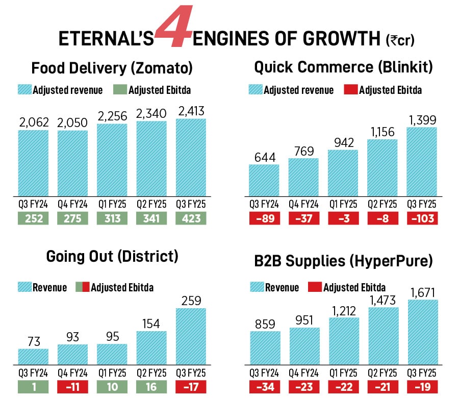 The latest and fourth pillar—District—started on an impressive note. Its new app, which houses going-out businesses such as dining, live events and ticketing, was rolled out last November and has so far had more than 6.5 million downloads. But it grapples with the same problems as Blinkit and HyperPure: Losses.