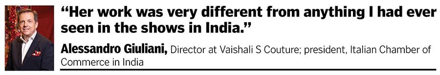 In 2019, Alessandro Giuliani—president of the Italian Chamber of Commerce in India and later a director at Vaishali S—visited her atelier. “It was very different from anything I had ever seen in the shows in India,” says Giuliani. He felt that, for its sheer creativity and sustainable processes supporting weavers, it deserved to be repositioned as Haute Couture on the official Paris Haute Couture calendar.