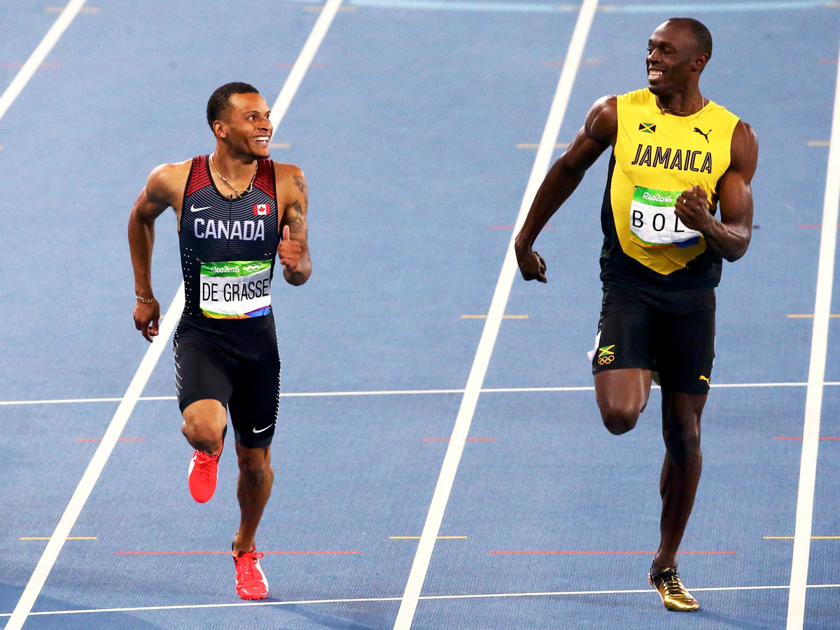Eight-time Olympic champion Usain Bolt (right) shares a smile with Andre de Grasse in the last few metres of the 200m semifinal in the 2016 Rio Games.
