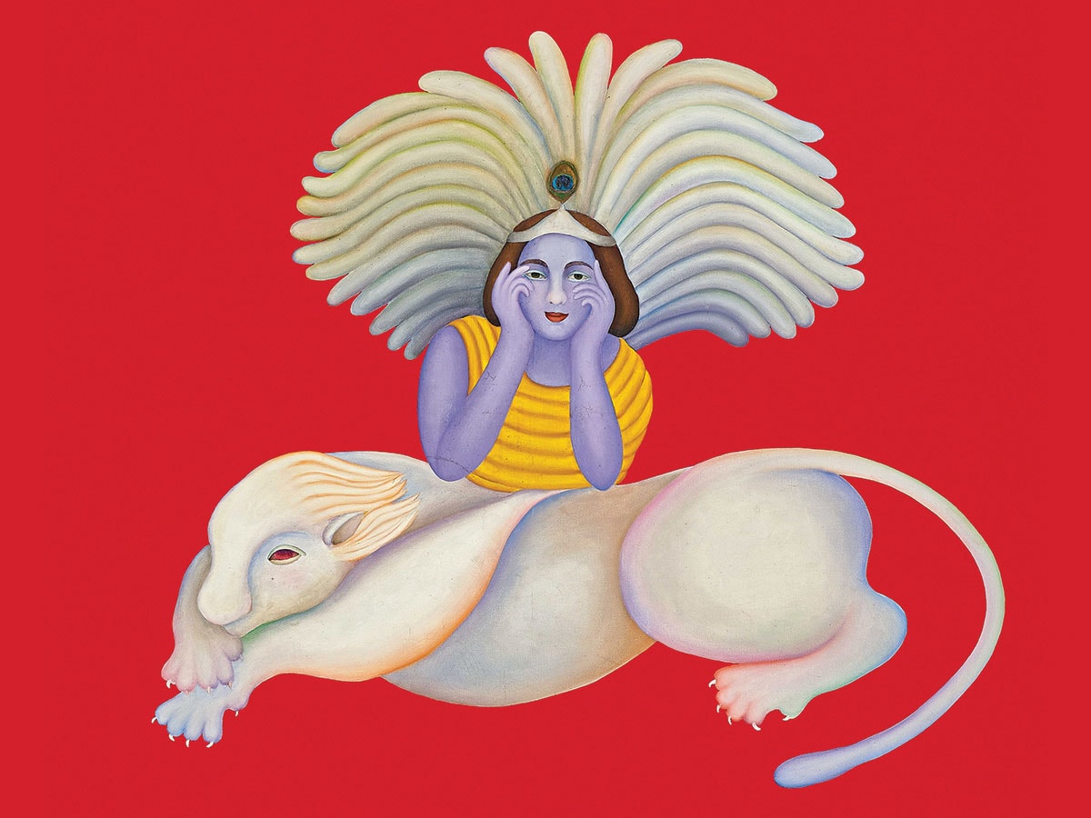 The ‘(Untitled) Krishna’ by Manjit Bawa exemplifies the artist’s distinctive ability to fuse myth, modernity and meditative stillness into a single, iconic image. Set against a luminous red ground, the composition presents a figure reminiscent of young Krishna resting dreamily upon a supine lion, rendered with a softness that defies gravity and narrative logic. Bawa strips the mythological subject of drama and spectacle, choosing instead a moment of quiet introspection. What distinguishes Bawa’s vision is his refusal to treat mythology as narrative illustration. Instead, he approaches it as a philosophical space—one where innocence, sensuality and transcendence coexist.