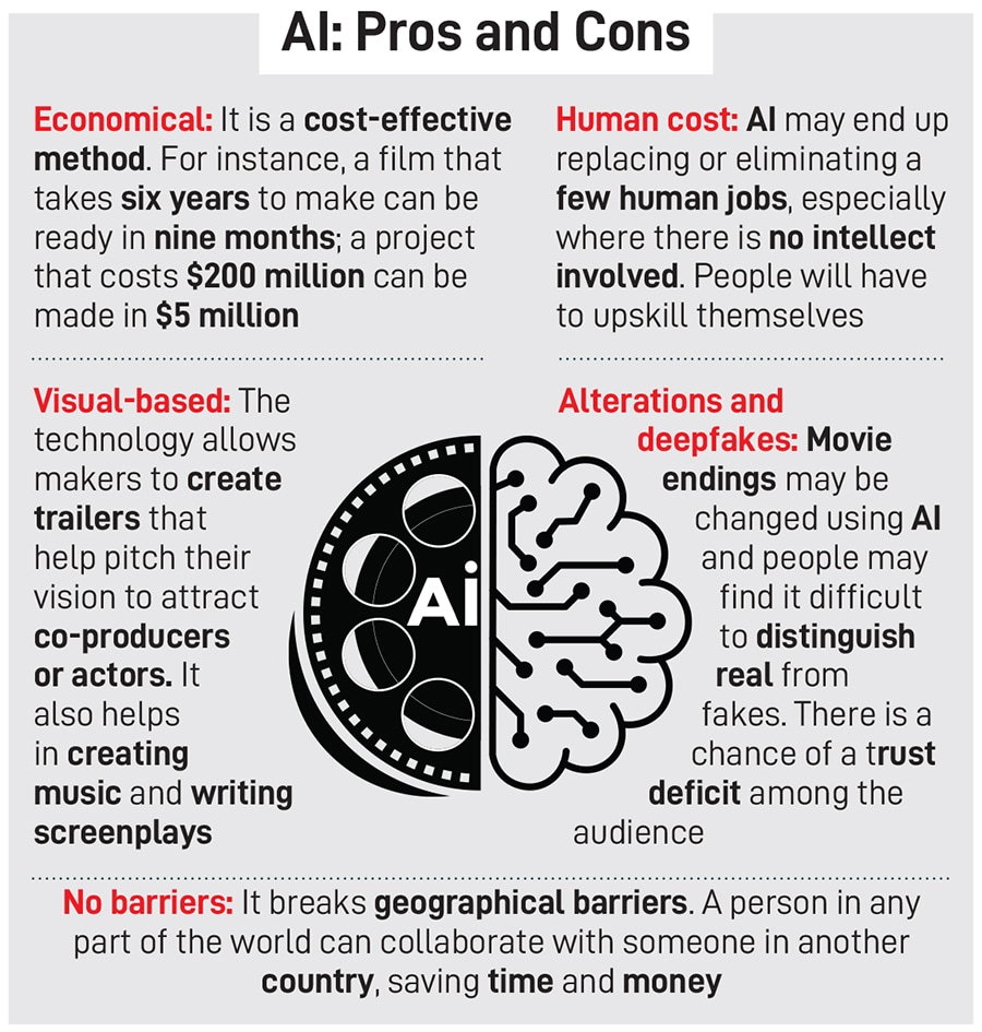 The producer-director was shocked with the results when he used the technology for music. He reveals that he already has 30 songs generated by AI ready for a feature film. “That doesn’t mean I will not go to a music composer or a singer. But I am not going with a reference… I am going with the real thing and saying this is what I want. My efficiency between my idea and execution has been narrowed,” he says, while emphasising that it is also light on the pockets.