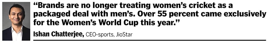 “So long as the support for women’s cricket was symbolic and was being celebrated because ‘even our girls did it’, commerciality was driven by perception. But once it can engage crores, it gets a solid commercial platform. The market will respect the women’s team for excellence, not gender. Once that starts to happen, you have broadcast reach,” says Shubhranshu Singh, a marketing veteran and the former head of marketing for Star Sports, who oversaw the launch of properties like the Pro Kabaddi League and led campaigns for ODI and T20 World Cups between 2014 and 2018. “This is where women’s cricket in India has finally moved from mere visibility to viability,” he adds.