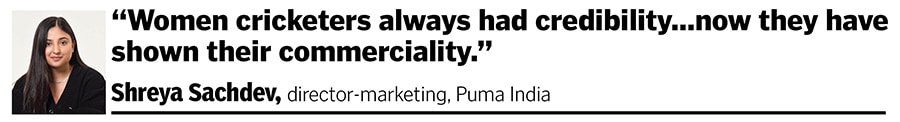 The surge in athlete equity isn’t confined to the marquee names alone. The World Cup victory has catalysed recognition beyond the likes of Harmanpreet Kaur, Mandhana and Rodrigues—visibilising the likes of, say, Deepti Sharma, who has always fallen under the radar of marketers despite a string of solid performances. “For those who aren’t endemic to the sports industry, this World Cup has been a watershed moment,” says Shreya Sachdev, director-marketing at Puma India, which has Kaur, Ghosh and Sharma as brand ambassadors. “Brand value quadruples and compounds when you don’t have to explain who the person in the advert is. This is a massive unlock and the reason why we will see the brand value of women’s cricket massively going up. Women cricketers always had credibility, and those of us in the industry have always known they were worth investing in. For those on the outside, now they have demonstrated the commerciality,”