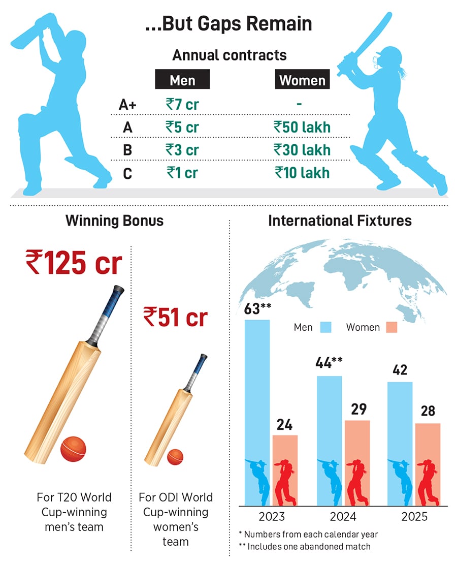 Besides, women cricketers were offered a central contract only in 2015, 11 years after their male counterparts; and while, in 2022, the BCCI brought in parity in match fees, a much-welcome move, there still remains a yawning divide between their annual fees: A Grade A-plus male cricketer earns ₹7 crore per year, compared to ₹50 lakh earned by a woman cricketer in Grade A, their highest bracket. Yet, the women’s team has consistently been benchmarked against the men’s team. “A constant comparison to men’s cricket has meant that women’s cricket was not as well received and lacked in its following. This World Cup has changed that perception. Women’s cricket has picked up a following and the followers now recognise that the two disciplines need to be viewed from two different lenses,” adds Prasanth.