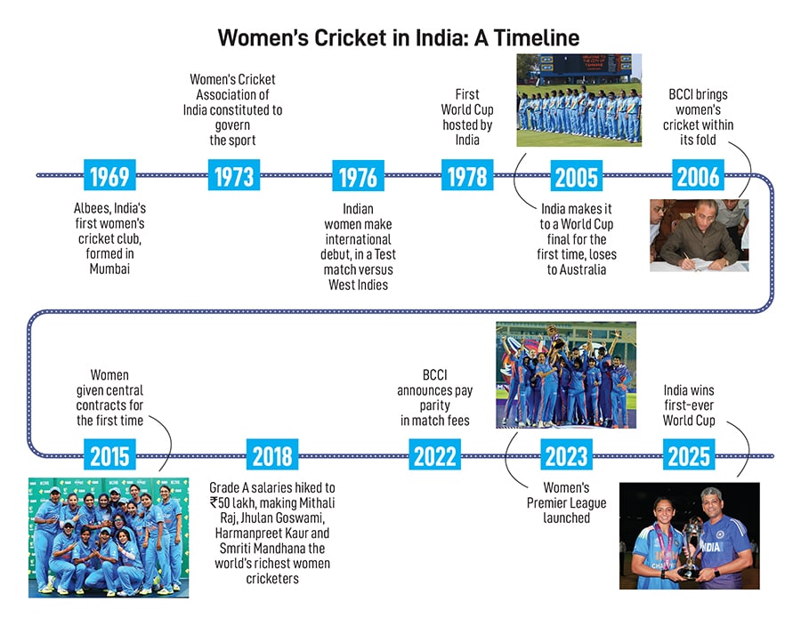 For cricket, too, this isn’t the first inflection point. “The turning point for women’s cricket in India came in 2017 when we played the final at the Lord’s Cricket Ground [in England],” says former captain Diana Edulji, the first Indian woman inductee to the ICC (International Cricket Council) Hall of Fame. “That match was telecast live, and it was a packed house at the stadium. Everybody started taking notice of women’s cricket after that.” Back then, Edulji was part of the Supreme Court-appointed Committee of Administrators (CoA), which was tasked with implementing the Lodha Committee reforms in the Board of Control for Cricket in India (BCCI) and that announced a ₹50 lakh incentive for each member of the team for making it to the final—which they would go on to lose to England.
