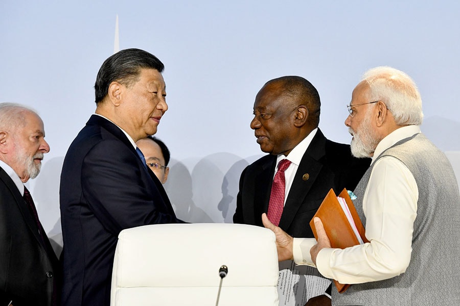 Indian Prime Minister Narendra Modi and Chinese President Xi Jinping and others meet on the sidelines of 15th BRICS summit in Johannesburg, South Africa, on August 24, 2023.Image: BRICS/Anadolu via Getty Images