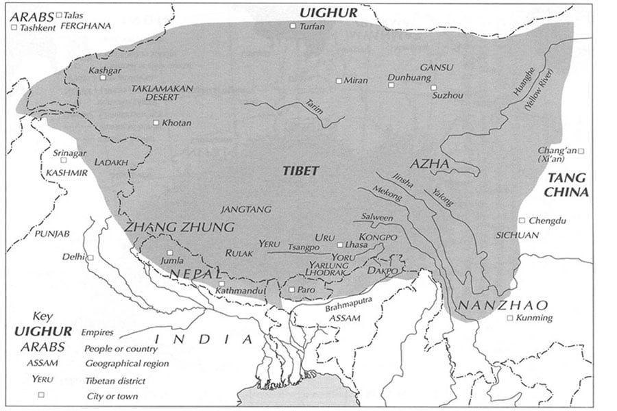 Map of the Tibetan Empire (in grey), late 8th-early 9th century from Kapstein, Matthew. The Tibetans, Blackwell, 2006