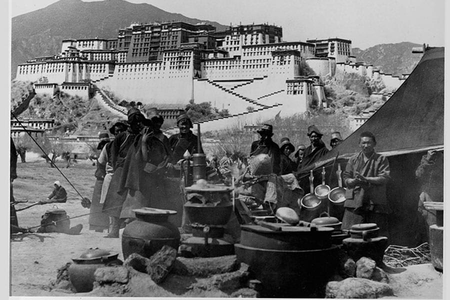 Tibetans stand by a tent, with the Potala, the palace of the Dalai Lama, behind them circa 1901. Image: LOC/Corbis/VCG via Getty Images