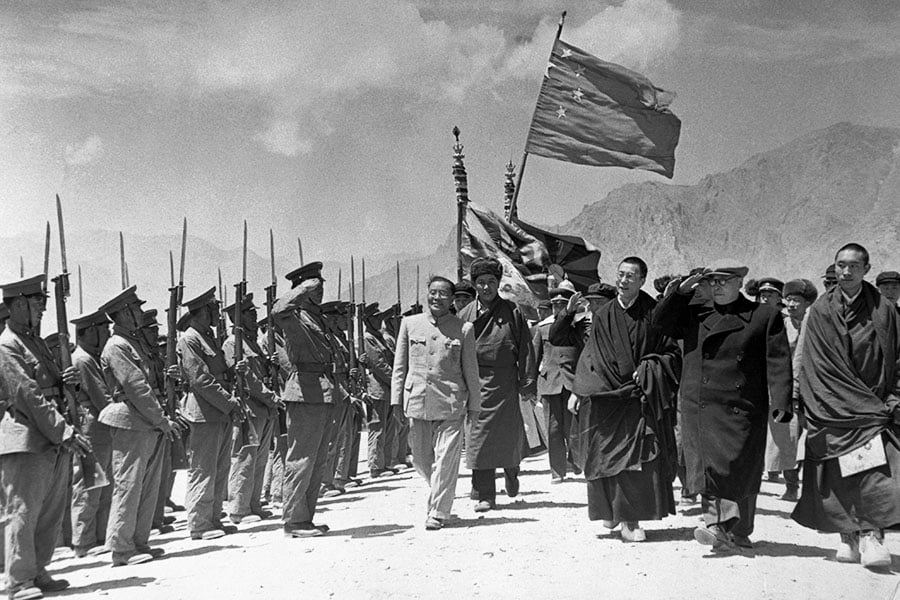 Chen Yi, vice premier of China (saluting, second from right) visits Tibet to organise Tibet’s inclusion in the Communist Chinese framework. Reviewing local troops with Yi are the Dalai Lama, spiritual leader, and Panchen Lama, May 1956. Image: Bettmann/Getty