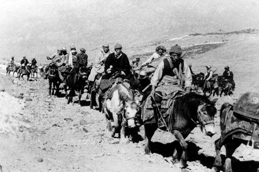 Tenzin Gyatso, the 14th Dalai Lama (centre, on a white horse) escapes from Tibet to India, on February 1, 1959. Image: Universal Images Group via Getty Images