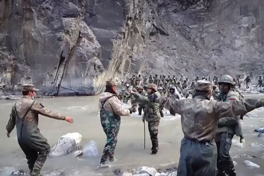 This video frame grab taken from footage recorded in mid-June 2020 shows Chinese (foreground) and Indian soldiers during the incident where troops from both countries clashed in the Line of Actual Control (LAC) in the Galwan Valley, in the Karakoram Mountains in the Himalayas. Image: CCTV/AFP