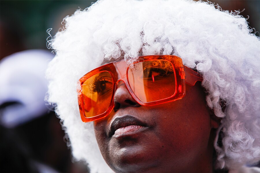 An attendee watches US DJ Mister Cee"s performance at a free block party commemorating 50 years of Hip-Hop in Brooklyn, New York, on August 5, 2023. The Five Block Party series features a loaded lineup of renowned DJs and seminal artists, along with street art installations.