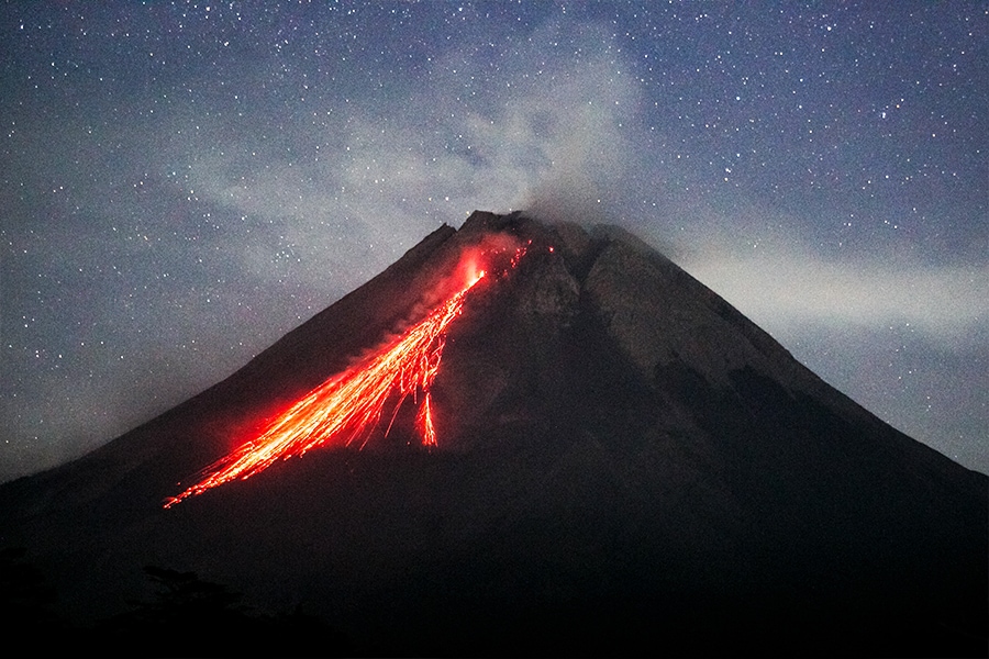 Mount Merapi erupts, spewing an avalanche of searing gas clouds and lava, seen from Wonokerto village, Yogyakarta, an ancient centre of Javanese culture in Indonesia, August 9, 2023. The volcano"s last major eruption in 2010 killed 347 people and displaced 20,000 villagers.