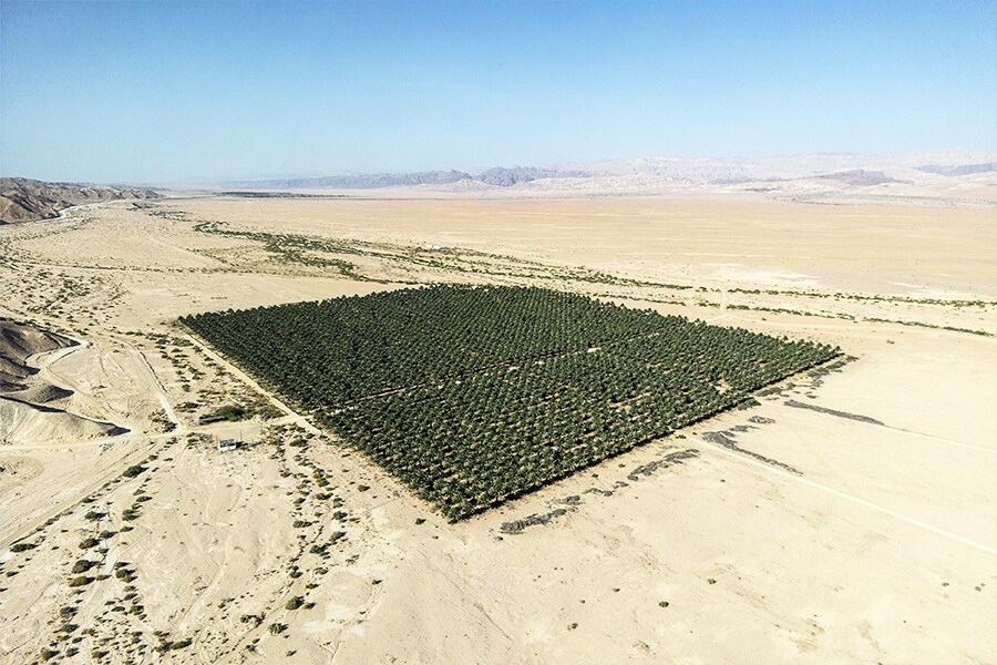 A view of a palm grove west of the highway at Aravah Valley in the Negev desert, Israel, on July 30, 2023. With no natural freshwater, treated sewage water from domestic use is allocated to farmers, enabling the arid region to support the agricultural industry, a prototype for the country and perhaps the world.