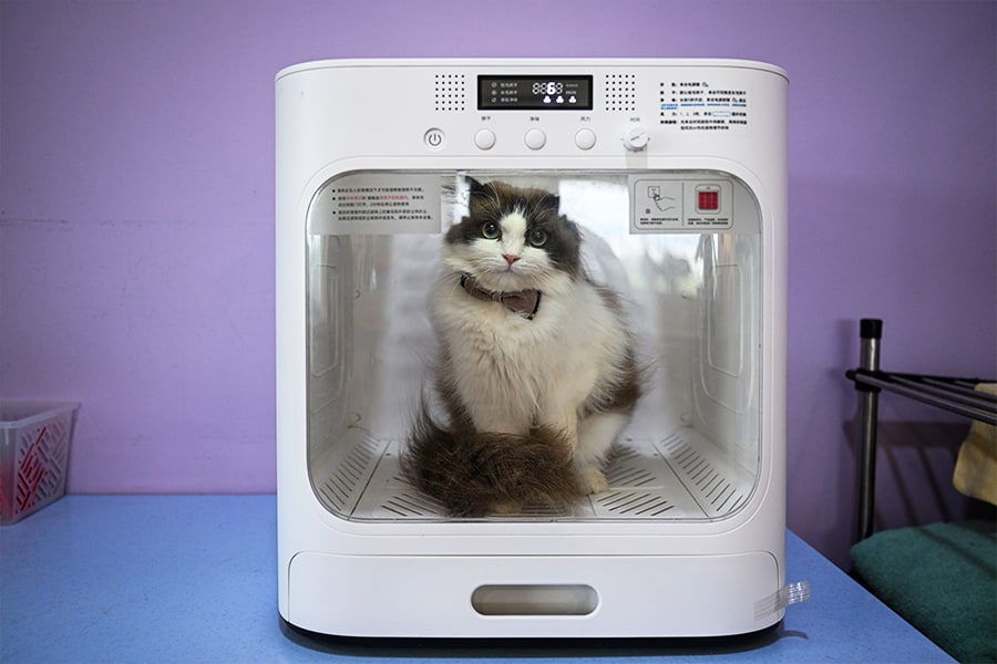 A cat sits inside a dryer at the Rocky"s Cat Club on the eve of International Cat Day in Ampang, Selangor, Malaysia, on August 7, 2023. Club regulars—cat and human—are greeted by Mr Flint, the front manager( a cat, of course) at the reception counter.