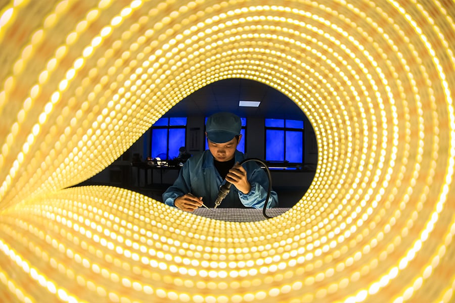 An employee works on the production line of LED strip lights at Jingyuxin Lighting Technology Co., Ltd. in Jiujiang, Jiangxi Province of China, on August 8, 2023. The penetration rate of LEDs worldwide is expected to reach around 76 percent in 2025, according to Statista.