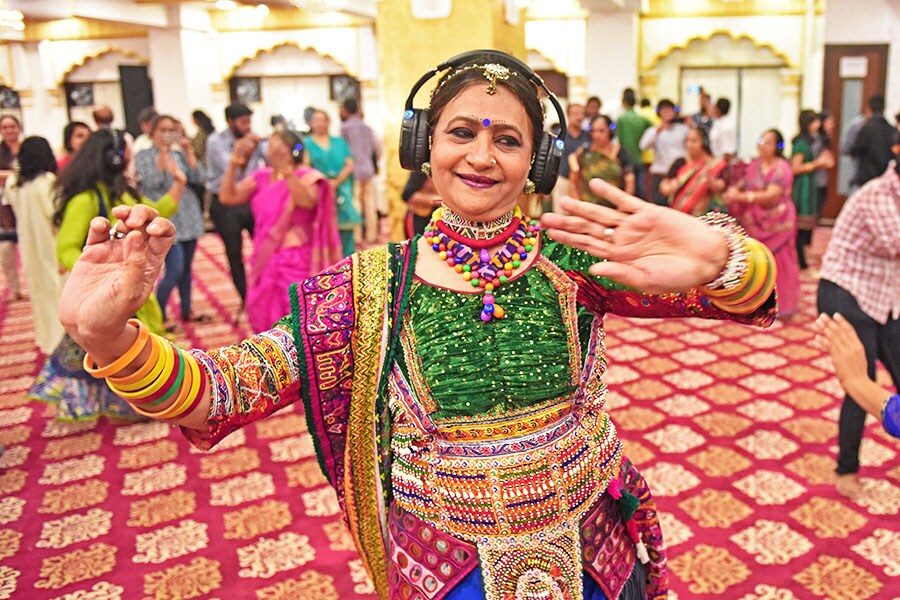 A file photo of a "silent" Garba at Rai Mahal Banquet, Malad, Mumbai, from 2017. Rajmahal Banquets introduced the concept of "Silent Garba" nights, which enabled dancers to groove to the tunes of their choice using headphones till 2 am without flouting city rules.